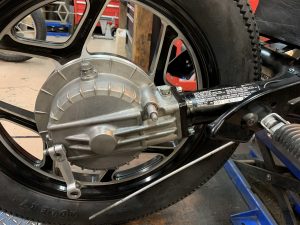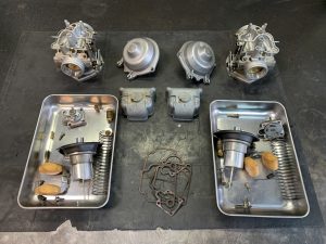 R100の場合はエンジンオイル、オイルフィルター、ミッションオイル、デフ、シャフトオイル、バッテリー(国産)は必ず交換。ヘッド増し締め、タペット、ロッカー周り点検調整、点火時期調整、キャブオーバーホール、キャブ同調、プラグ交換も必須項目となります。